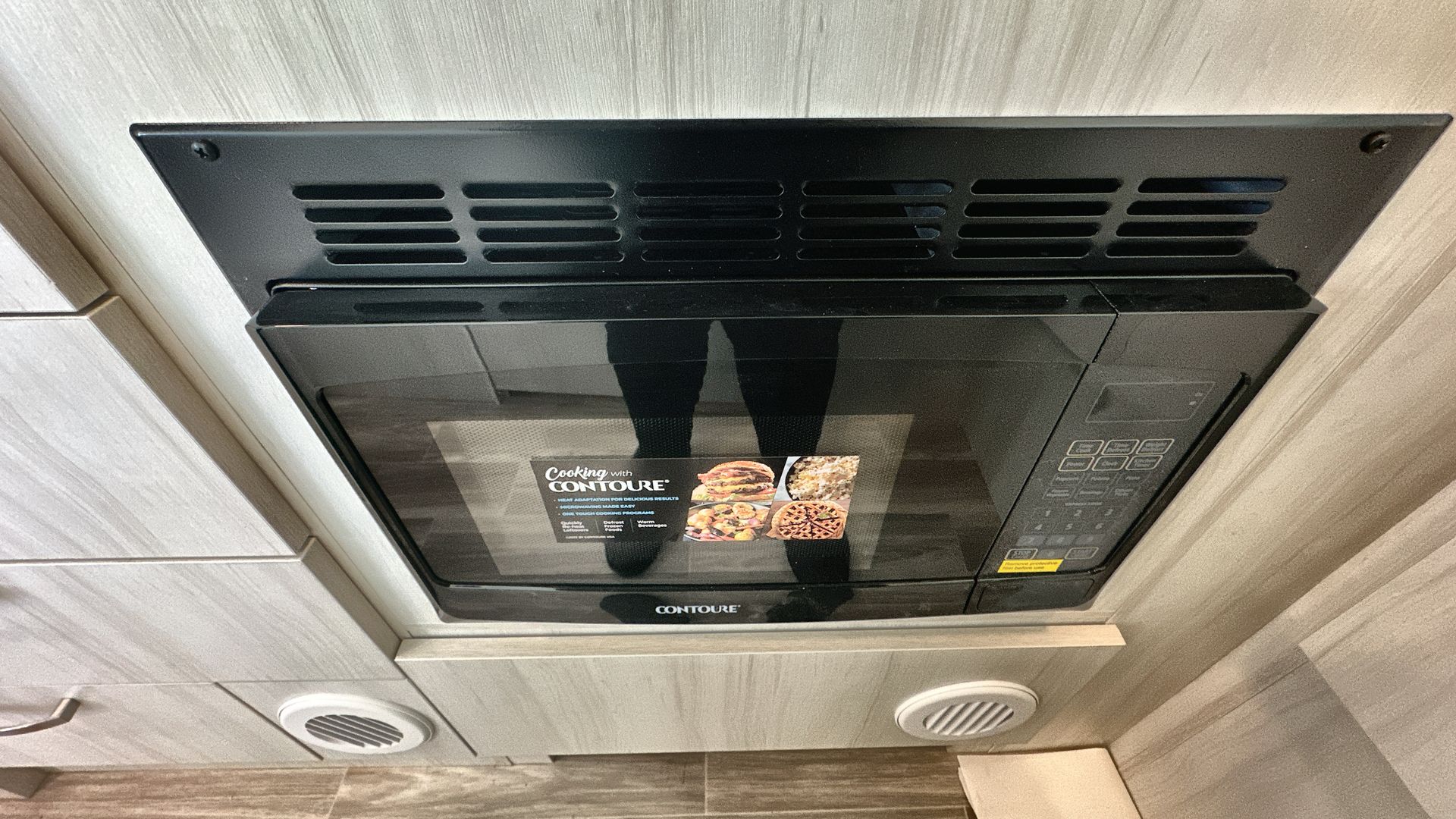The living area is designed for relaxation and entertainment, complete with a multi-purpose dinette that can seat up to four people. This space easily converts into an additional sleeping area if needed. The kitchenette is equipped with modern appliances, including a two-burner stove, a microwave, and a refrigerator, making meal prep a breeze.