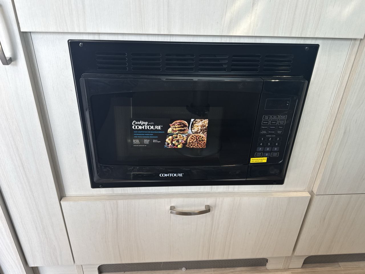 The kitchen is equipped with a two-burner stove, microwave, and a compact refrigerator, along with ample storage for cooking essentials. The U-shaped dinette serves as both a dining area and an additional sleeping space, accommodating up to four people.