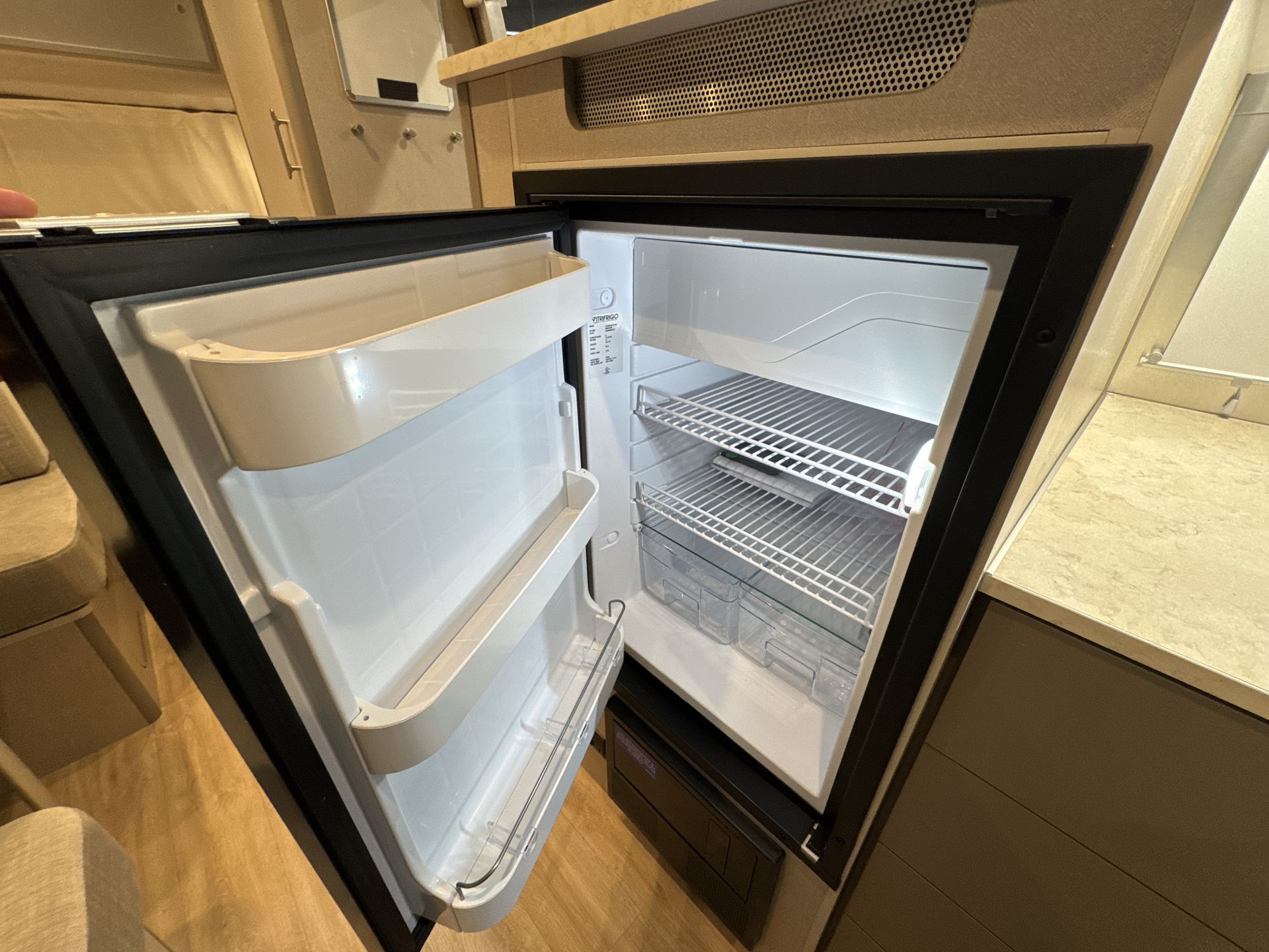 The bathroom, located at the rear, includes a spacious shower, a plastic toilet, and sufficient storage for toiletries and towels. With vinyl flooring throughout, cleaning is a breeze, allowing more time to enjoy your travels.