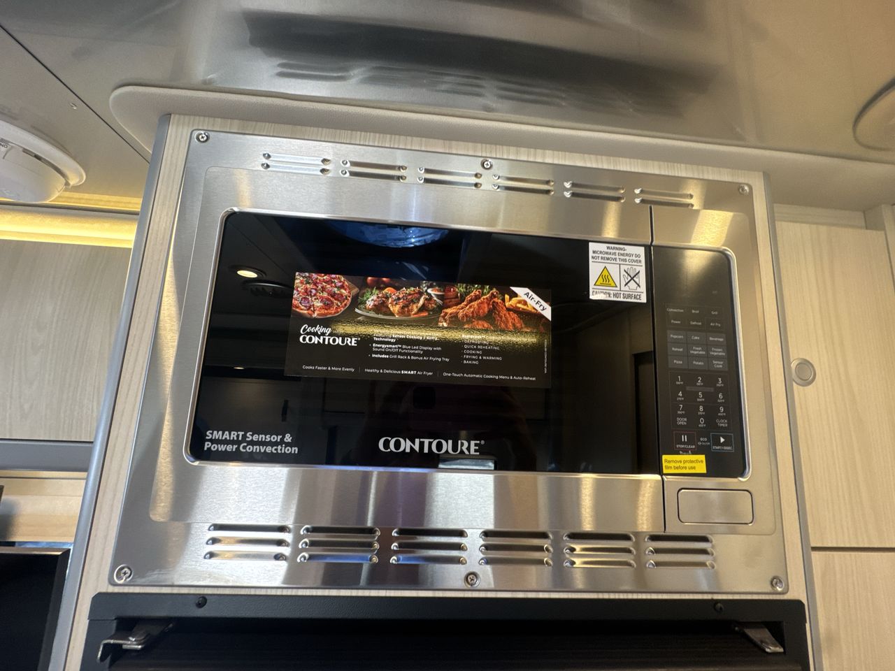 The kitchen is equipped with high-end appliances, including a two-burner gas stove, a convection microwave oven, and a mid-size refrigerator with a freezer. Solid-surface countertops, a large stainless steel Kohler® sink, and a slide-out pantry enhance both functionality and style, making it easy to prepare homemade meals on the road.