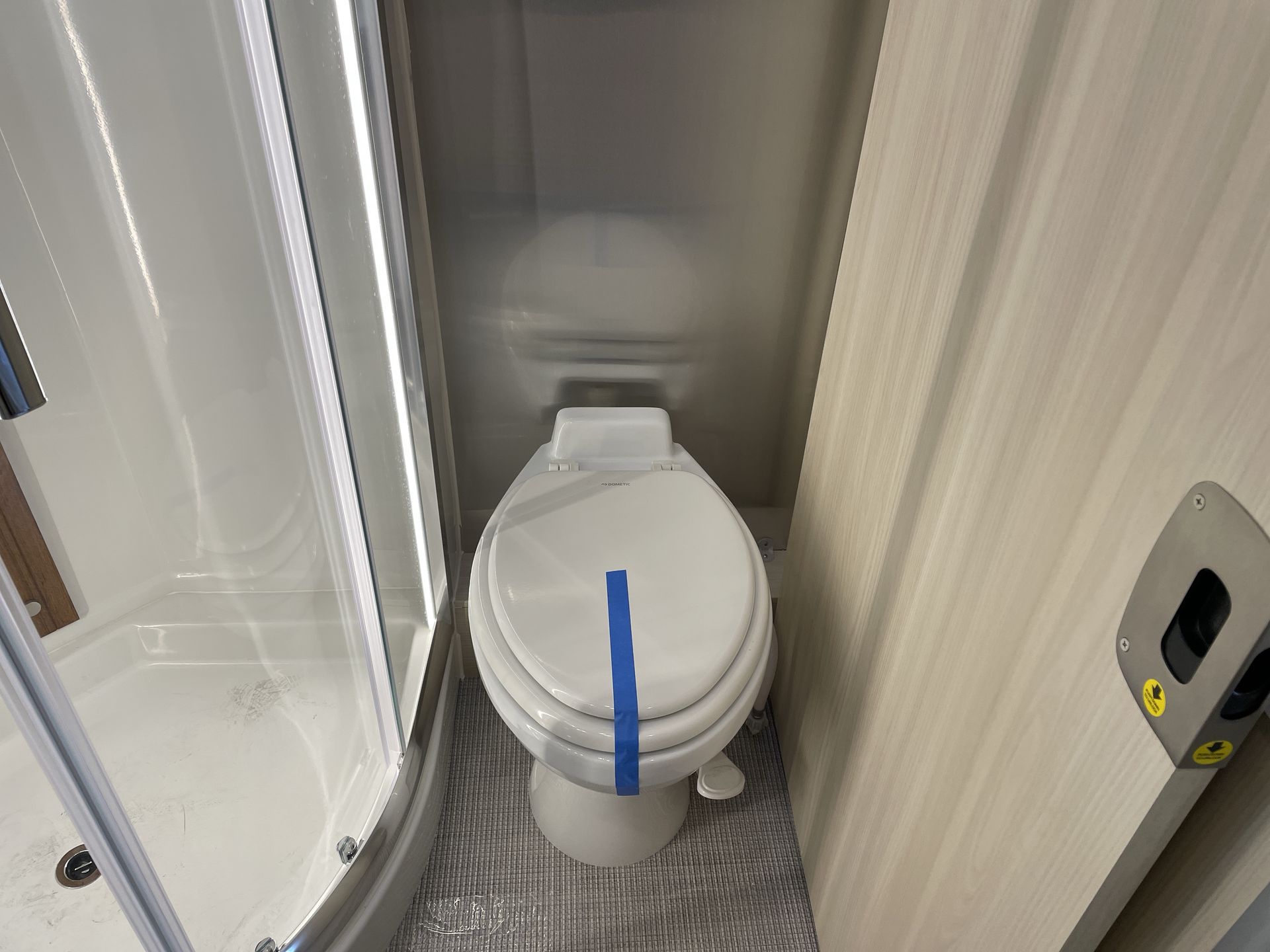 The full bathroom spans the entire rear of the RV, offering a spa-like retreat with a spacious shower featuring a teak inlay, a porcelain toilet, and a large vanity with a mirrored cabinet. A cedar-lined closet inside the bathroom provides ample storage, and a single door closes off the space for privacy.