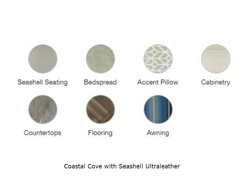 Sleeps 4 Length 23 ft 11 in Ext Width 8 ft Ext Height 9 ft 7 in Int Height 6 ft 6 in Interior Color Coastal Cove with Aqua Ultraleather, Coastal Cove with Seashell Ultraleather Hitch Weight 500 lbs GVWR 6000 lbs Dry Weight 5100 lbs Cargo Capacity 900 lbs Fresh Water Capacity 37 gals Grey Water Capacity 37 gals Black Water Capacity 17 gals Tire Size ST225/75R15 Furnace BTU 18000 btu Available Beds RV Queen Refrigerator Type 12V Electric w/Freezer Refrigerator Size 6.8 cu ft Cooktop Burners 3 Number of Awnings 1 LP Tank Capacity 30 lbs Water Heater Type Tankless On Demand LP AC BTU 13500 btu TV Info LR 24" 12V DC Smart TV, BR 24" 12V DC Smart TV Awning Info Powered Zipdee with Sunbrella Fabric; Rear & Roadside Window Awnings Axle Count 2 Number of LP Tanks 2 Shower Type Standard Electrical Service 30 amp Similar Floorplans