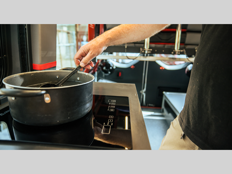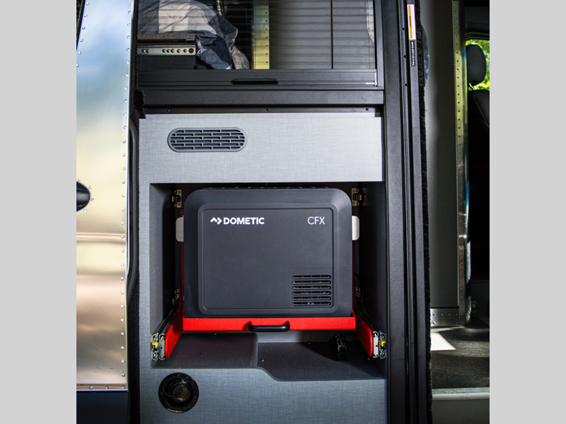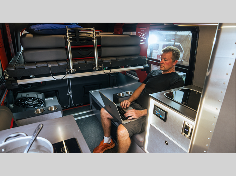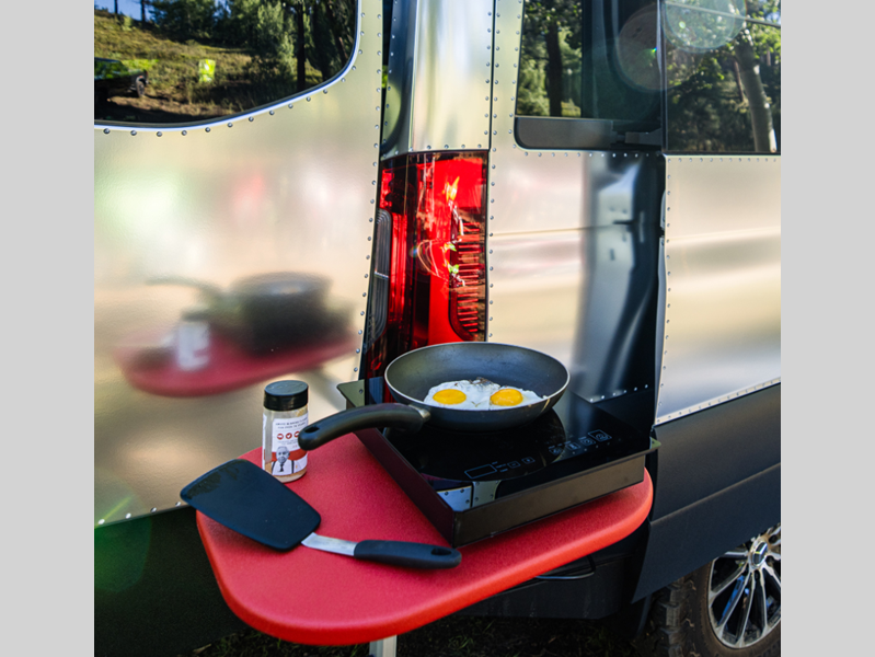 You will also appreciate having fully adjustable shocks and capable LED lighting to help light the way on back roads. The versatile bed system can slide out the back doors, or you can remove the bed to make more storage for bikes, hiking gear and more! There is ample storage space throughout, including an L-track system, cabinets, and overhead lockers. With a stowable induction cooktop, you can cook indoors or outdoors, plus the refrigerator is accessible from inside or out!